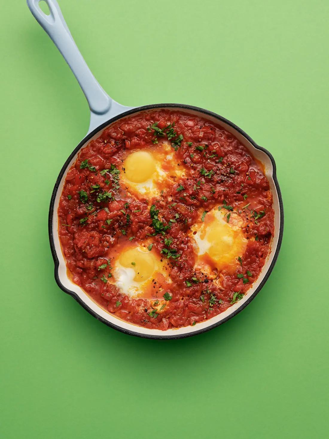 Gör hål i såsen i stekpannan och knäck äggen i hålen.