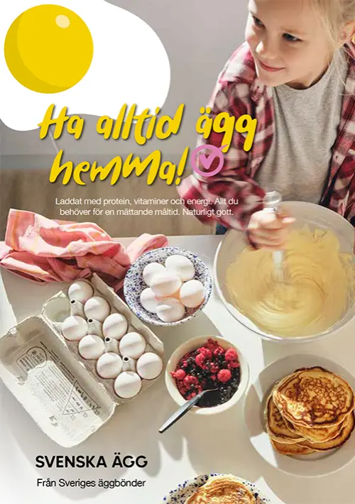 Informationsbroschyr om svenska ägg, ”Ha alltid ägg hemma”. Innehåller bland annat fakta ur Ungdomsbarometerns undersökning kring unga äggkonsumenter, information om certifierad svensk äggkvalitet och fakta om de näringsrika äggen. 16 sidor A4.