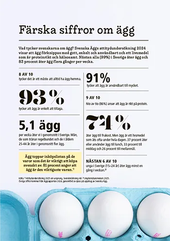 visar att ägg förknippas med gott, enkelt och användbart och ett livsmedel som är proteinrikt och hälsosamt. Nästan alla (99%) i Sverige äter ägg och 83 procent äter ägg flera gånger per vecka.